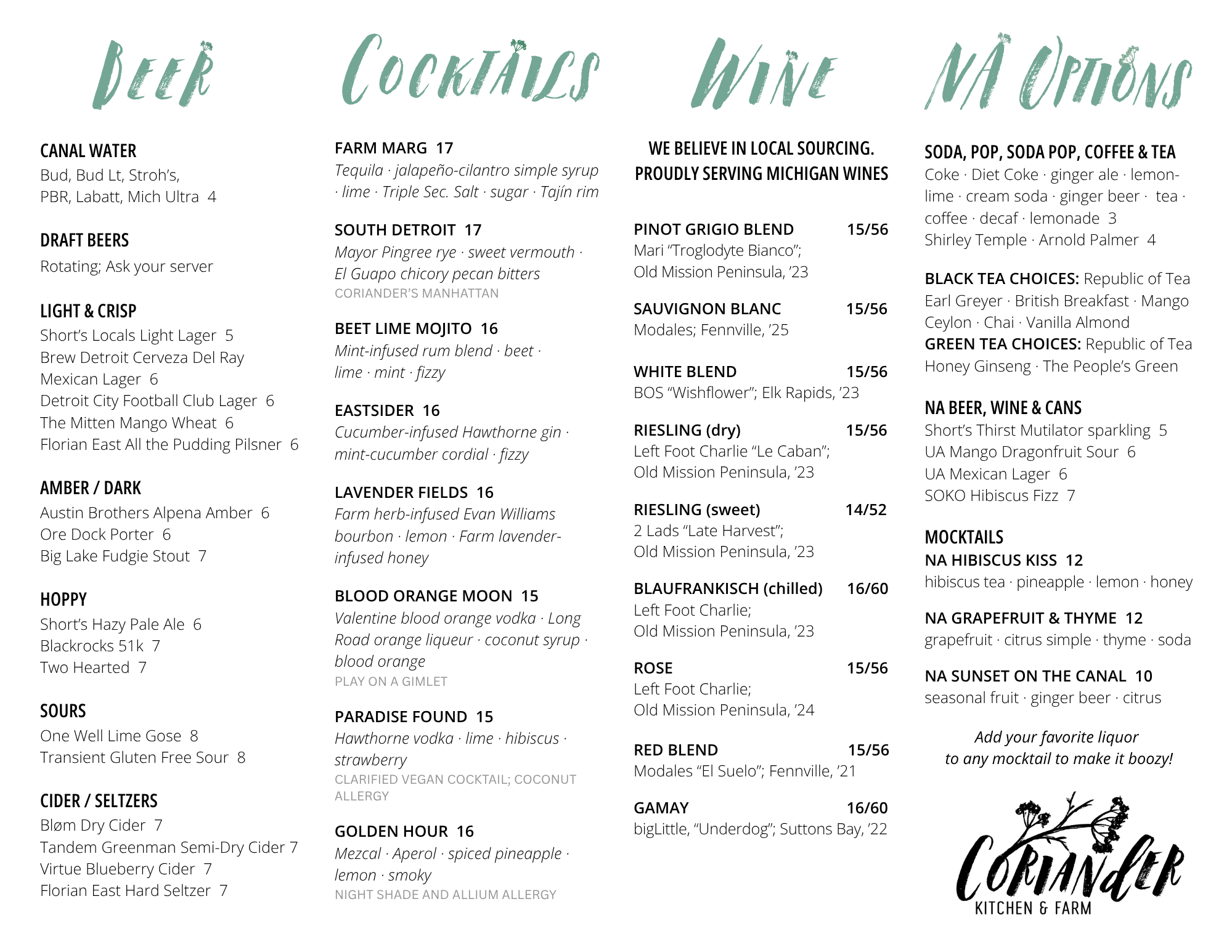 Our Bar Manager Chris Lochan uses the same philosophy at the bar as Chef Ali does at our table: fresh, sustainable, seasonal and local. That means our farm-grown herbs in our cocktails and fresh, bold flavors. Plus, we always have great zero-proof options!