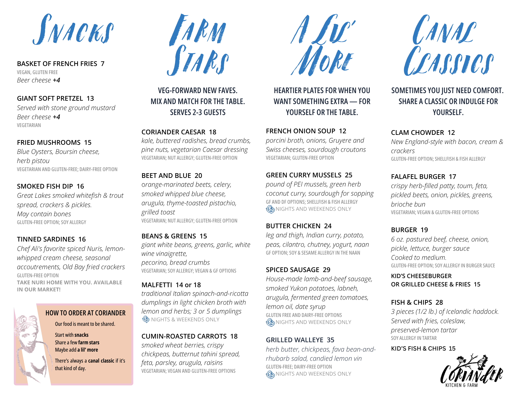 But that connection to the land and the seasons mean our menus are always changing based on what is being harvested on our farm and by our local farmer partners. And sometimes Mother Nature is fickle. We might want pickles, for example, but she blighted our cucumber crop last year! So check back here frequently to know exactly what’s being served at our table.